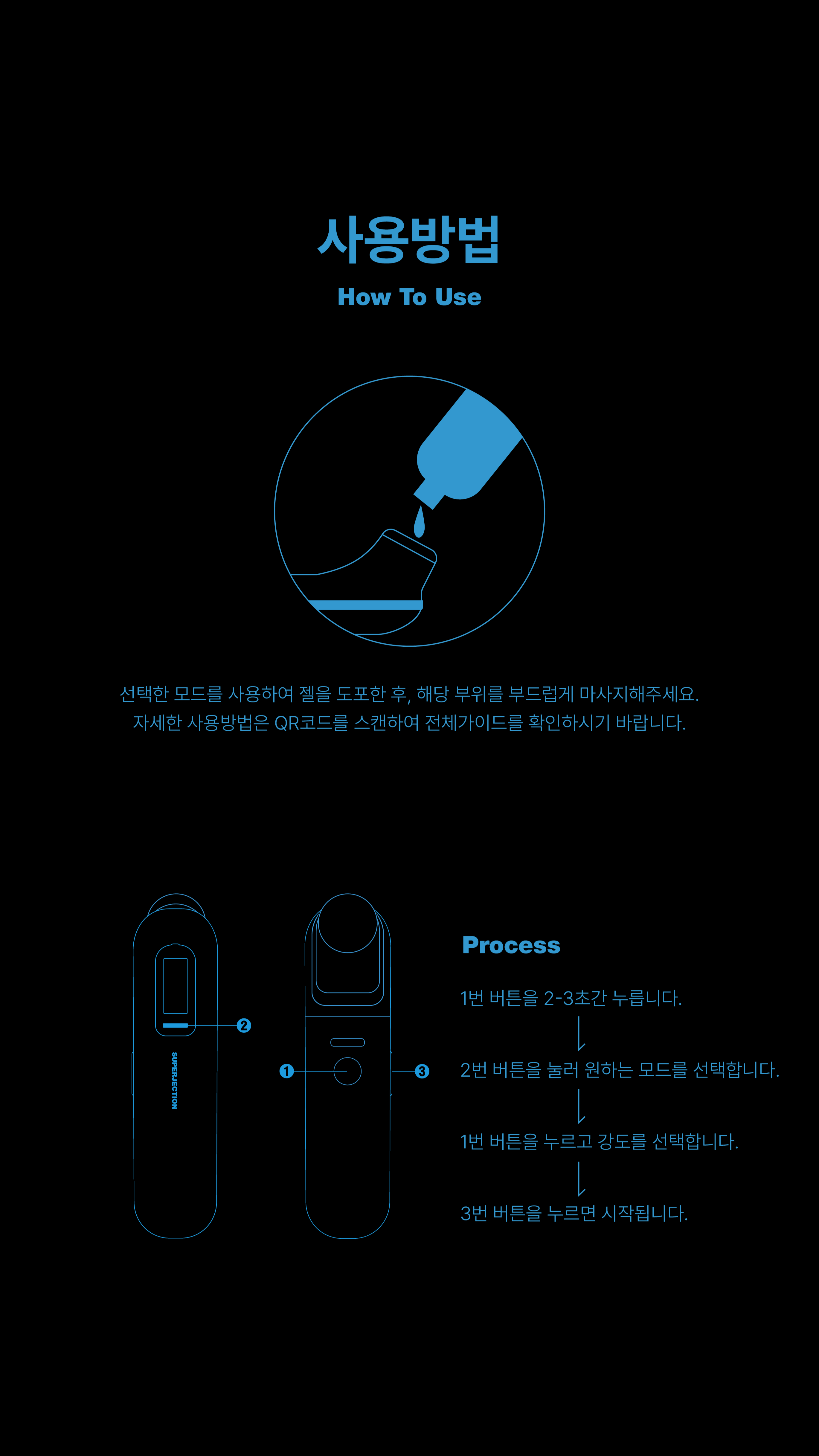 Apply ultrasonic gel to the face, then gently massage using the Superjection Device.