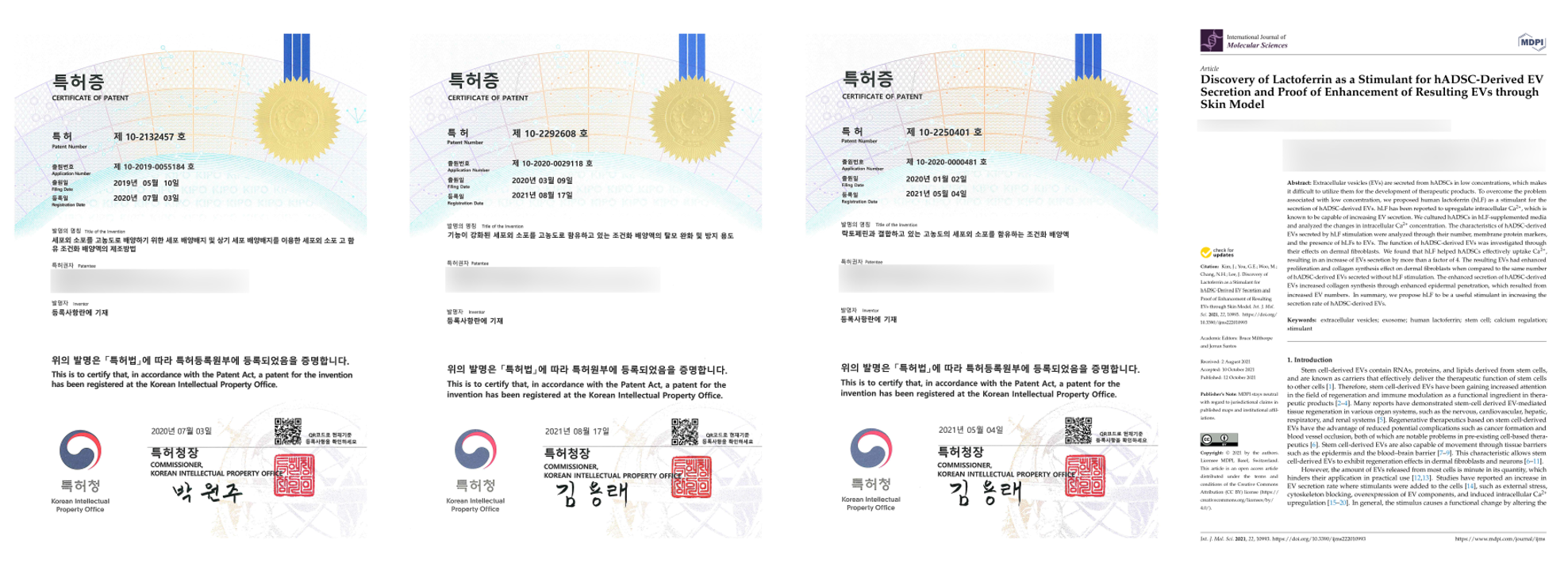 • Conditioned media containing high-density extracellular vesicles combined with lactoferrin | Patent No. 10-2250401