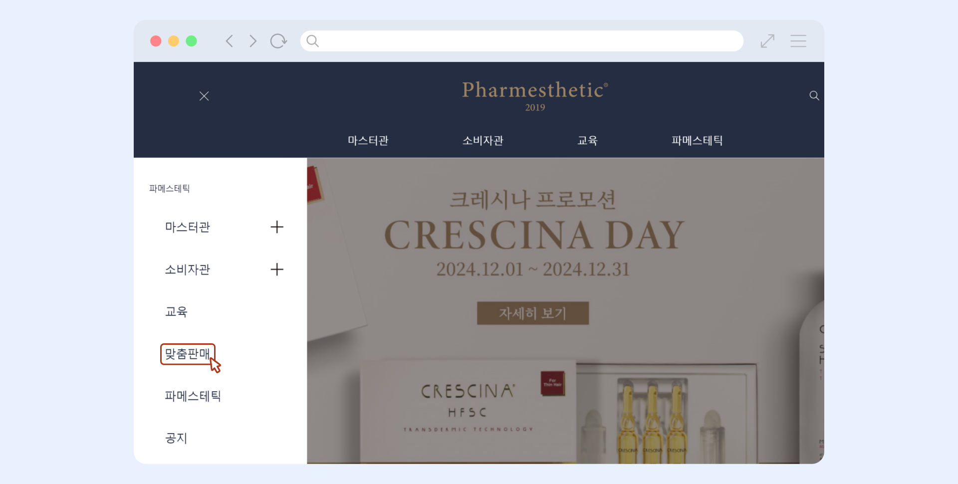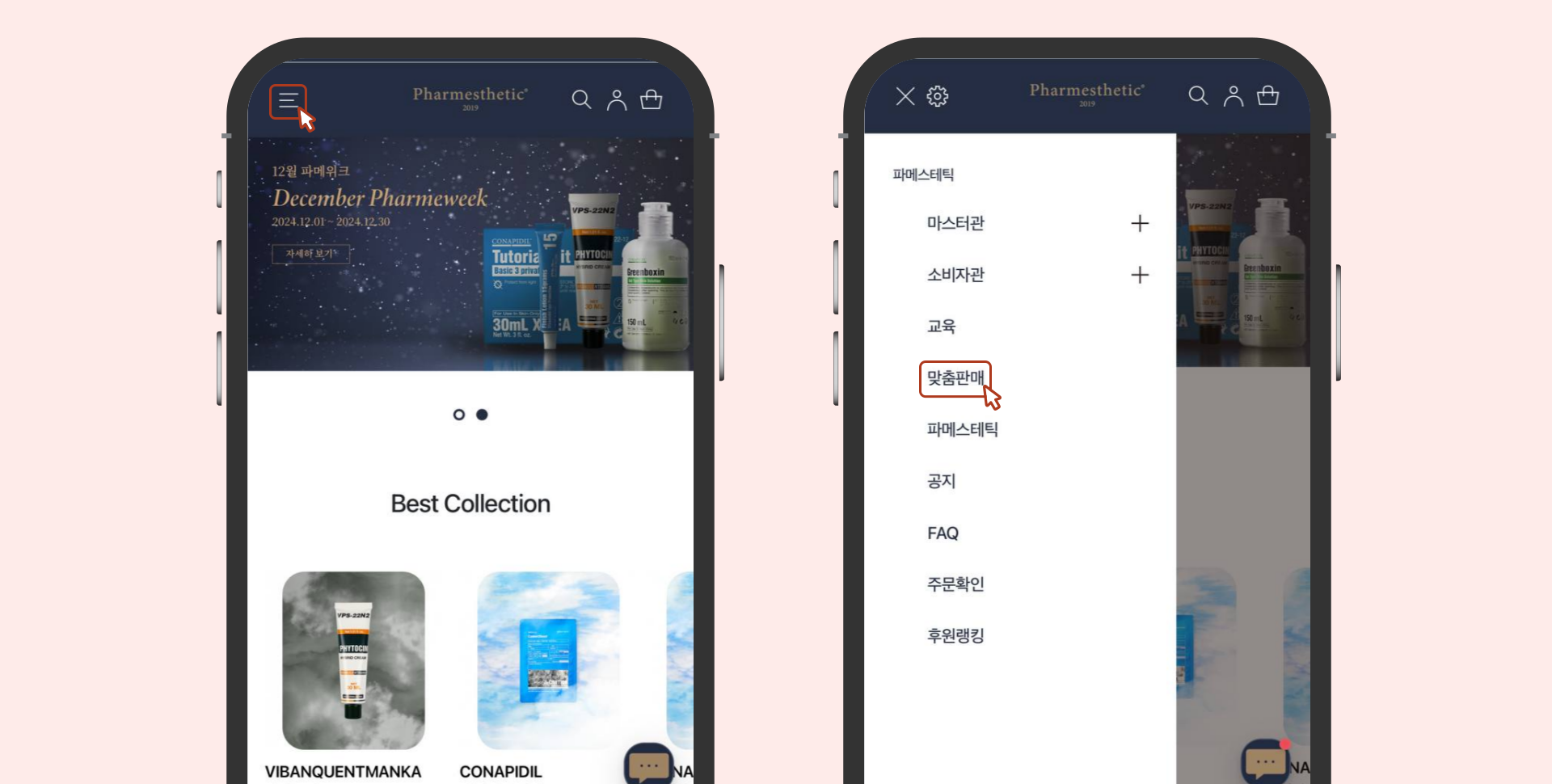 파메스테틱 공식 홈페이지(https://pharmesthetic.com/)에 접속해 왼쪽 상단의 메뉴(☰) 버튼을 눌러주세요.