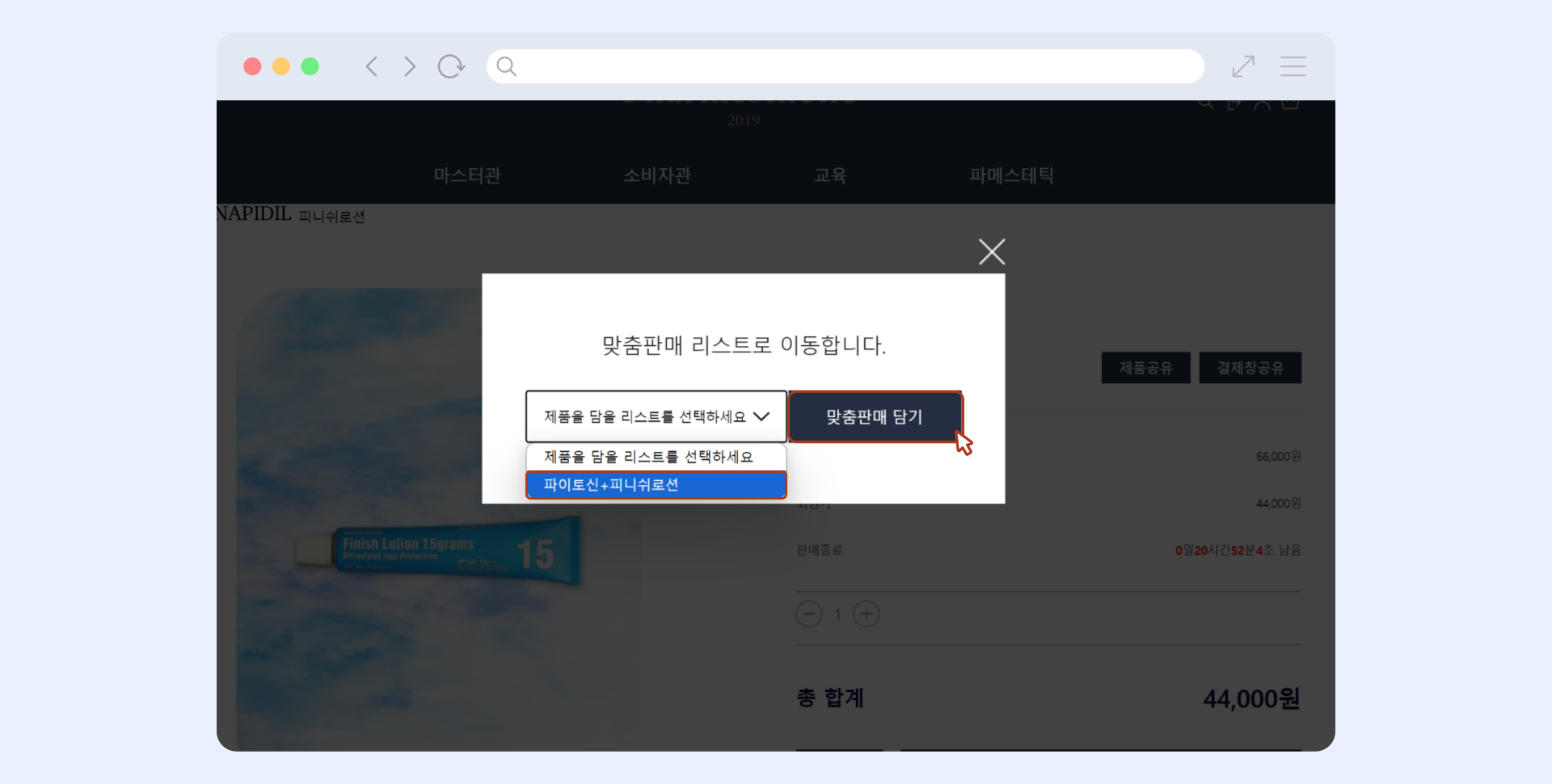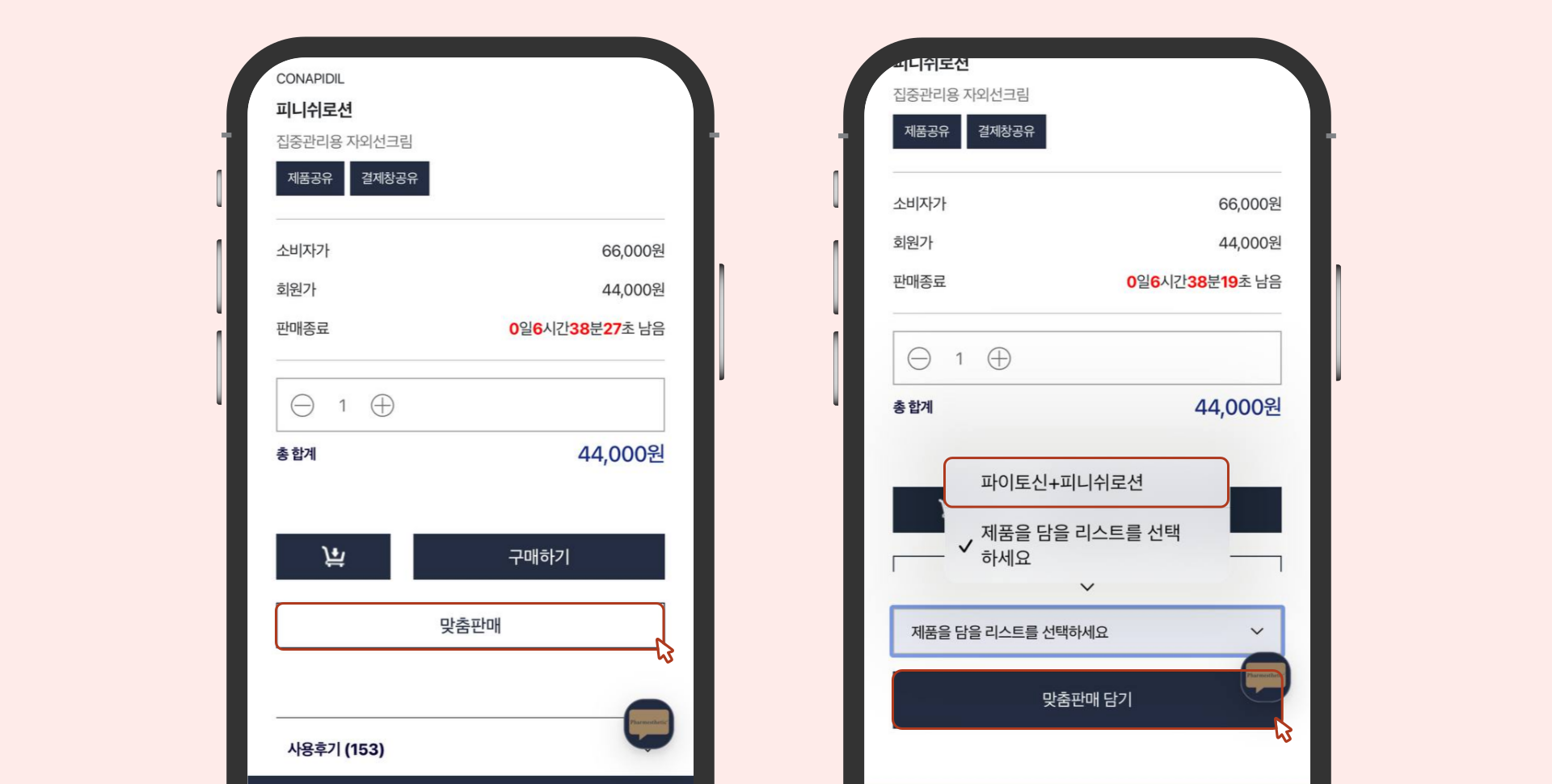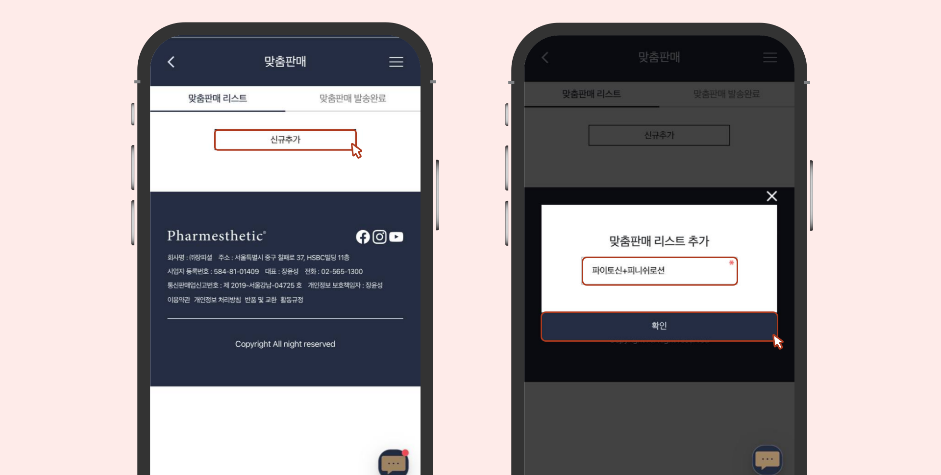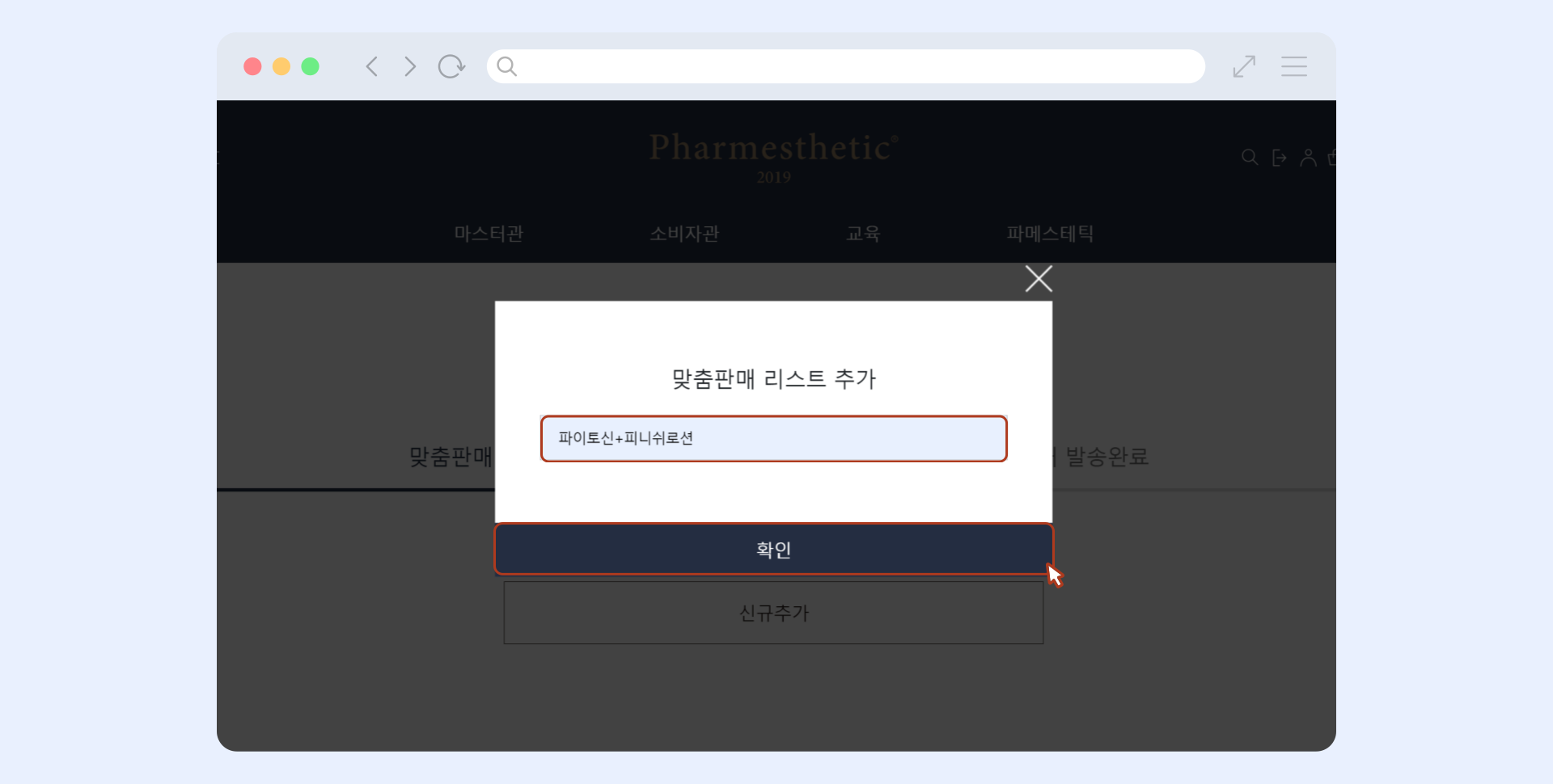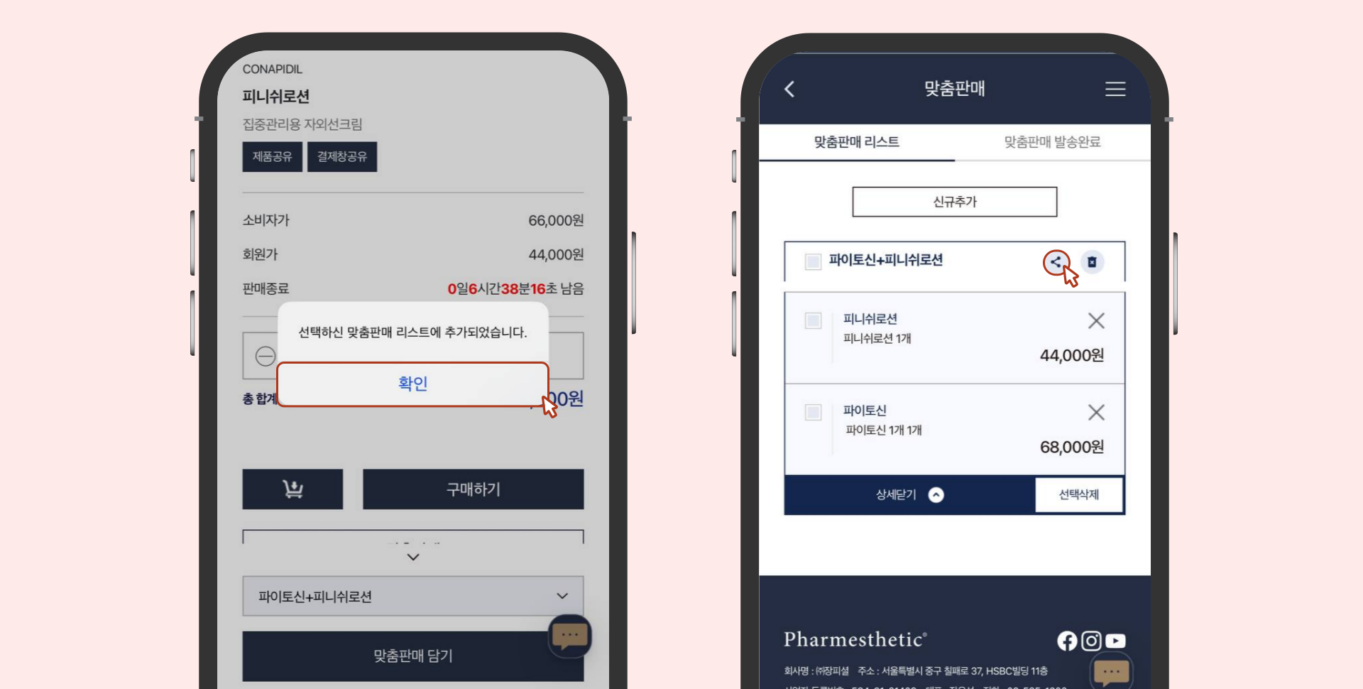 [PC / 모바일] 파메스테틱 공식 홈페이지 > 맞춤판매 > 신규 추가 > 이름 설정 > 맞춤판매 담기 > 맞춤판매리스트 공유