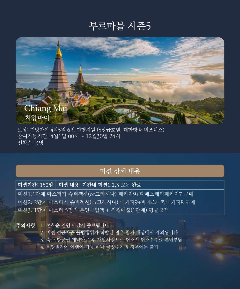 2025년 4월 1일 00시~12월 30일 24시까지 아래 미션 모두 달성 시 치앙마이 4박5일 6인 여행 지원(대한항공 비즈니스 클래스, 5성급 호텔)