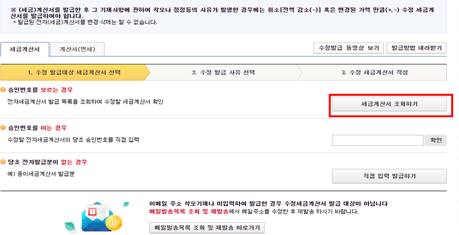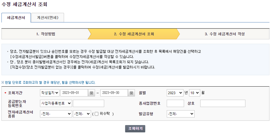 전자(세금)계산서 수정발급 페이지에서 세금계산서 조회하기 버튼을 눌러주세요.