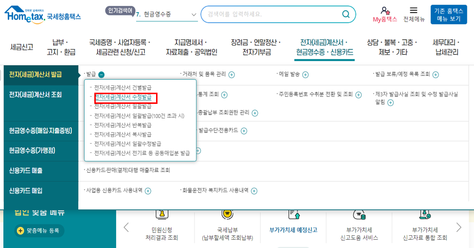 상단의 메뉴에서 전자(세금)계산서·현금영수증·신용카드 버튼을 눌러주세요.