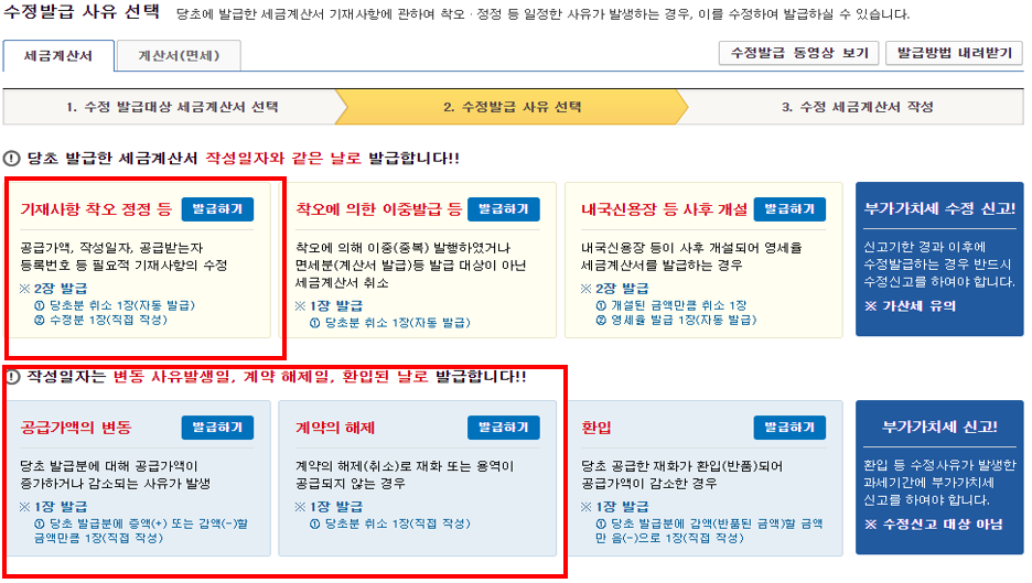 1) 기재사항 착오 정정 등 : 계산서 날짜, 금액 등이 잘못 기재되어 취소 및 수정계산서를 같이 발행해야 하는 경우