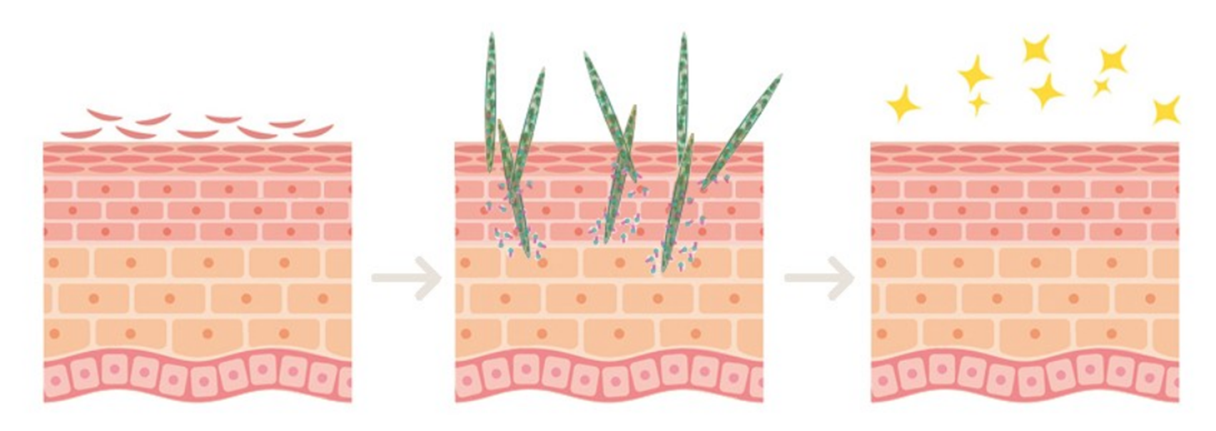 200마이크로미터의 스피큘의 자극으로 인체가 가지고 있는 치료면역시스템을 활성화 하여 세포 재생