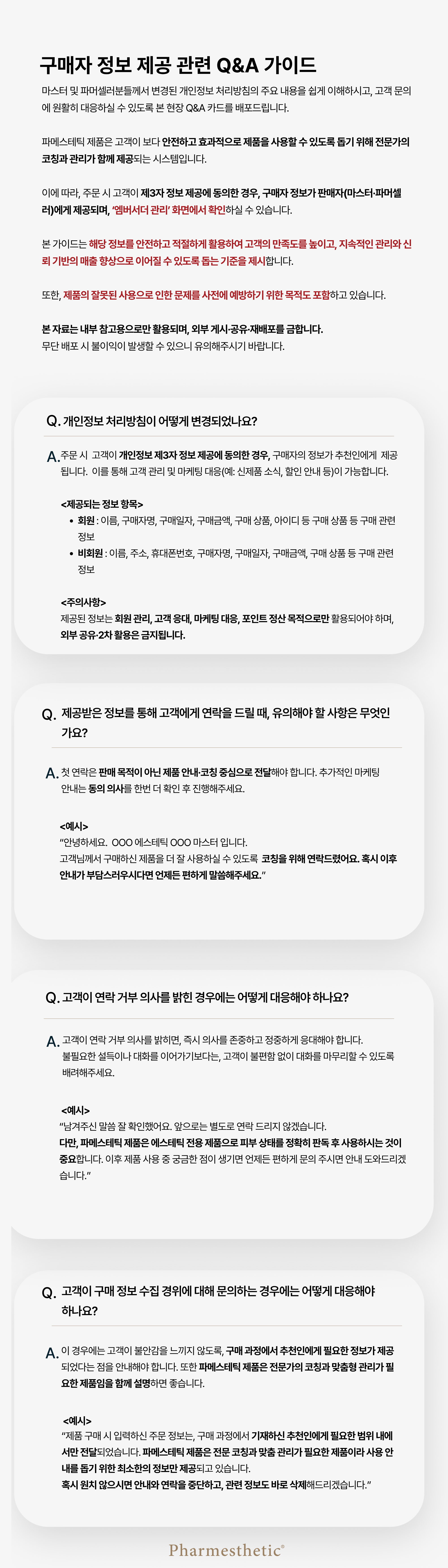마스터 및 파머셀러분들께서 변경된 개인정보 처리방침의 주요 내용을 쉽게 이해하시고, 고객 문의에 원활히 대응하실 수 있도록 본 현장 Q&A 카드를 배포드립니다.