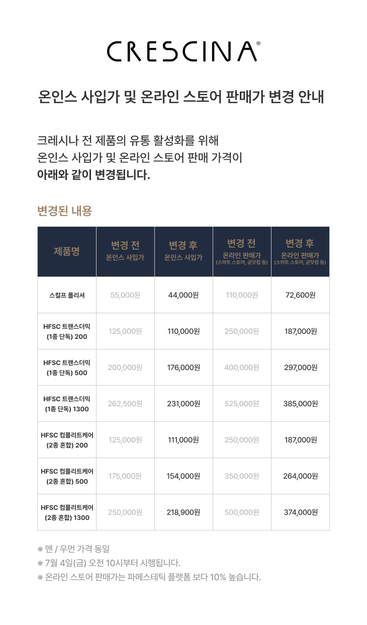 크레시나 전 제품의 유통 활성화를 위해 온라인 인증 스토어 사입가 및 판매 가격이 오는 2025년 7월 4일(금) 오전 10시부터 변경됩니다.